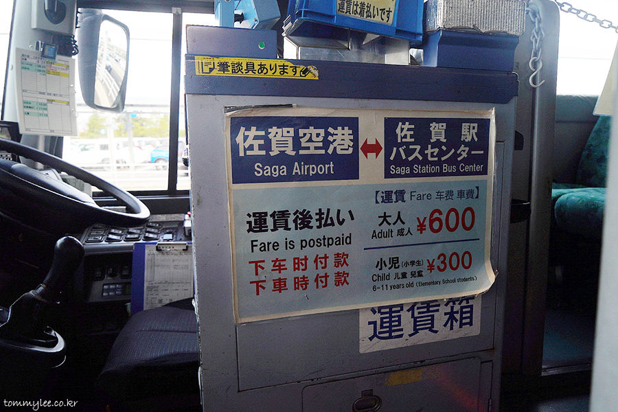 사가공항-사가역 버스센터를 운행하는 특별편이고요.. 요금은 600엔, 현금 승차, IC카드 가능하고.. 버스 내에서 잔돈 교환 가능, IC카드 충전 가능하다고 합니다.. 타기 전엔 몰랐는데 안내 스탭이 사가역까지 동승하더라고요.. 버스 안내원이 진짜 불필요한 것 같았는데.. 이게 일본식 일자리 창출이라고 합니다.. 아하~..