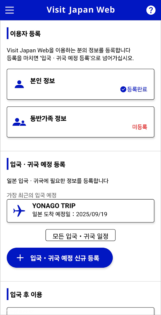 비지트 웹 재팬에 로그인을 하면 기존에 등록해 두었던 본인 정보와 동반가족 정보가 이렇게 등록완료에 체크되어 있는 모습을 확인하실 수 있고요.. 전에 다녀왔던 일본 입국 서류들도 히스토리에 보이게 된답니다.. 다 무시하시고 아래쪽에 있는 파란색 '입국 · 귀국 예정 신규 등록'을 누르시면 됩니다..