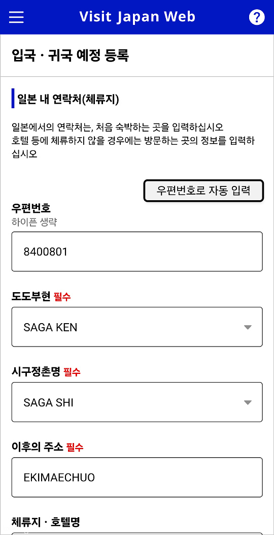 다음은 일본 내 연락처 등록인데요.. 일본에 있는 호텔 주소를 입력하면 됩니다.. 호텔 우편번호 7자리를 입력하니 도도부현 시구정촌명까지가 자동으로 입력이 되네요.. 번지수 등의 나머지 호텔 상세 주소 입력 하고.. 일본 내 연락 가능한 전화번호는 호텔 전화번호를 입력해 주시면 끝입니다..