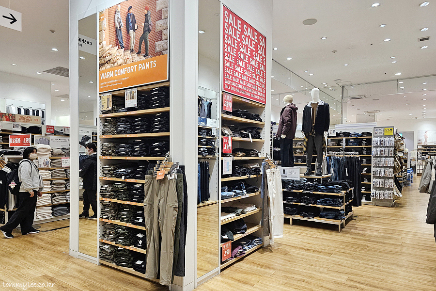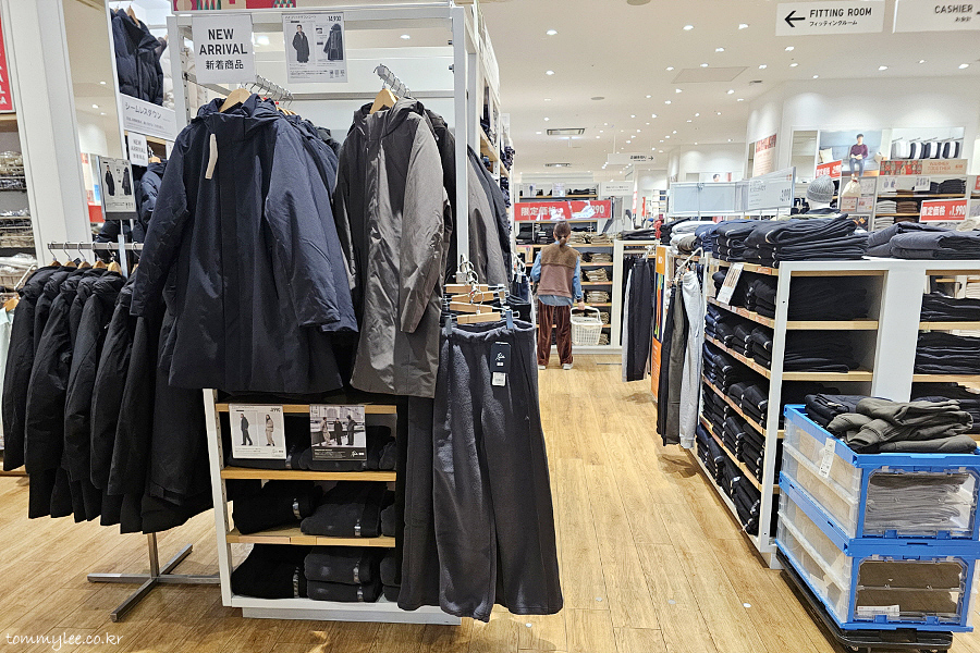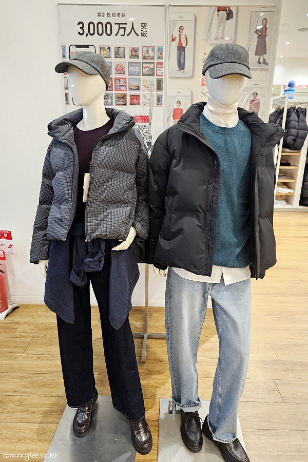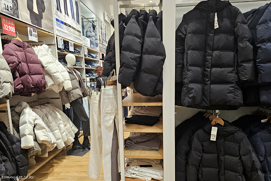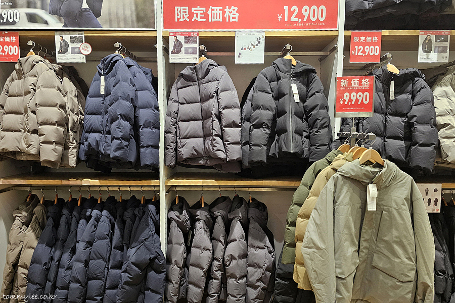 하지만 모든 제품이 한국보다 일본이 더 저렴한 것은 아니랍니다.. 이 점포의 겨울 시즌 주력 상품인 심리스 다운파카 같은 경우, 의외로 한국이 더 저렴합니다.. 아우터이다 보니가격 차이가 꽤 나요.. 아무래도 일본보다 훨씬 추워서 다운류 판매량이 더 많아서 그렇지 않나 싶어요.. ㅡㅡㅋ..