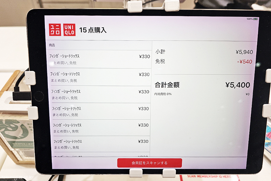 핑거 쇼트삭스 블랙 12, 화이트 2에 제 팬츠 하나 해서 15점 가격이 5,940엔 나왔는데요.. 소비세 540엔이 빠져서 5,400엔을 결제하게 되었답니다.. 면세면 그냥 가격표 붙은 가격 그대로 낸다고 보시면 되겠어요..