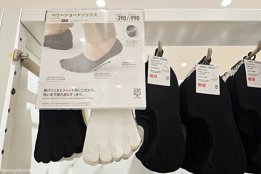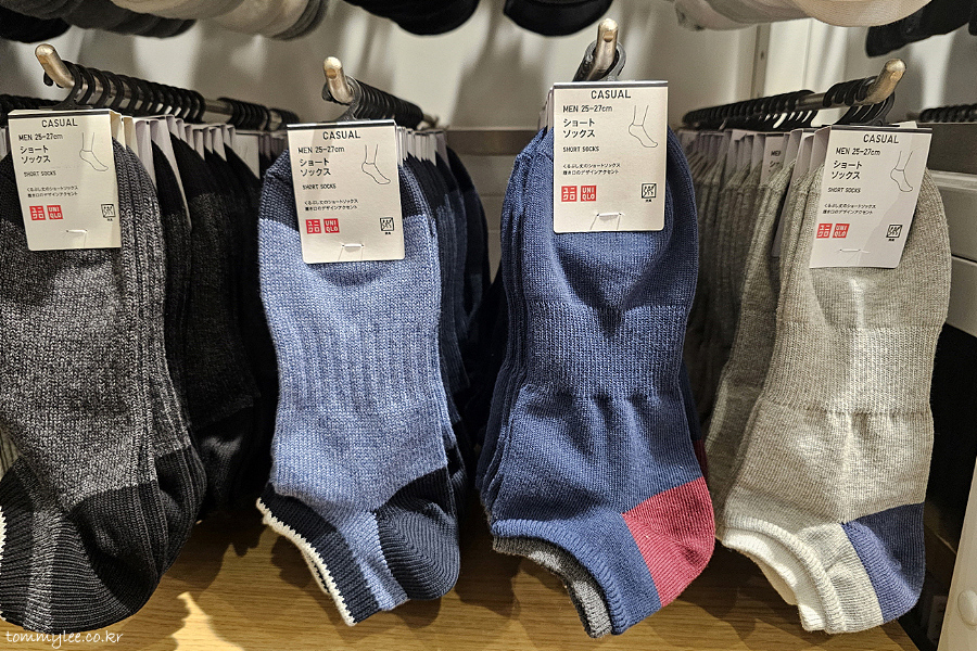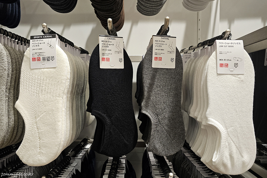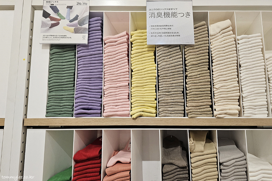 언더웨어를 지나서 이제 삭스 코너로 진입입니다.. 근데 요즘 유니클로는 이런 일반 양말에도 발냄새 덜 나게하는 소재로 만드나 봐요.. 실 가격이 싸진 건지.. 암튼 저 설명이 진짜인지 의문스럽지만..