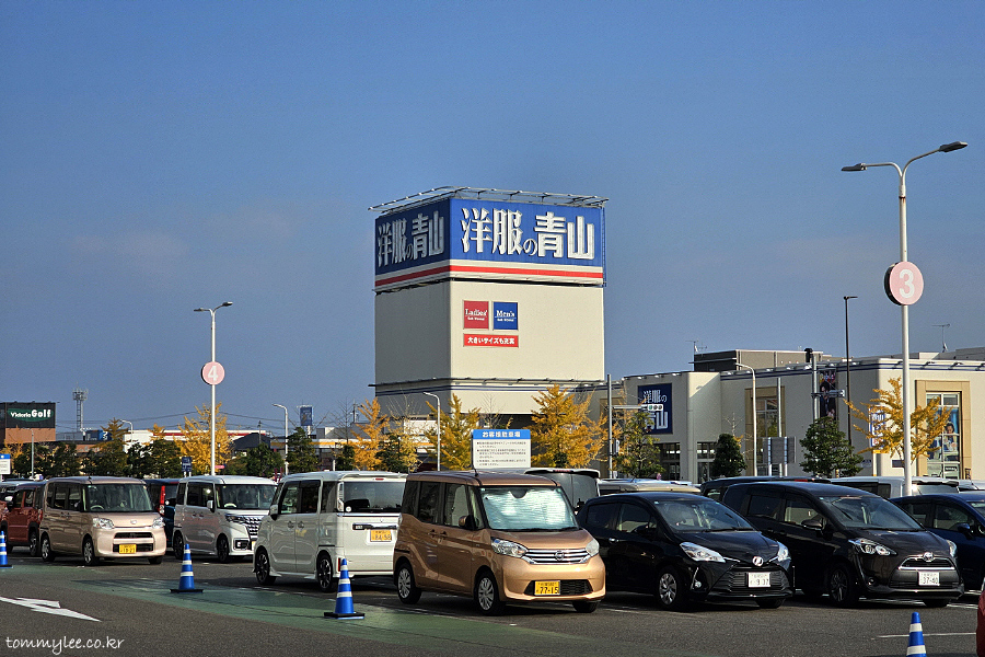 차리차리를 타고 이온몰로 고고.. 쿠라즈시에서 사가아레나 방향으로 쭉~ 앞만 보고 달리면 유메타운이 나옵니다.. 유메타운 간판보다 먼저 나온 건 아오야마였지만요.. 암튼 구글 지도에 따르면 쿠라즈시에서 유메타운까지는 도보로 무려 34분이나 걸린다고.. ㄷㄷㄷ.. 자전거 없으면 택시를 부르거나 버스를 이용해야 하는데.. 택시는 일본어가 가능해야 콜할 수 있고, 버스는 한 번에 가는 노선은 없고 사가역까지 가서 환승하는 수밖에 없다고 합니다.. ㅡㅡ;;..