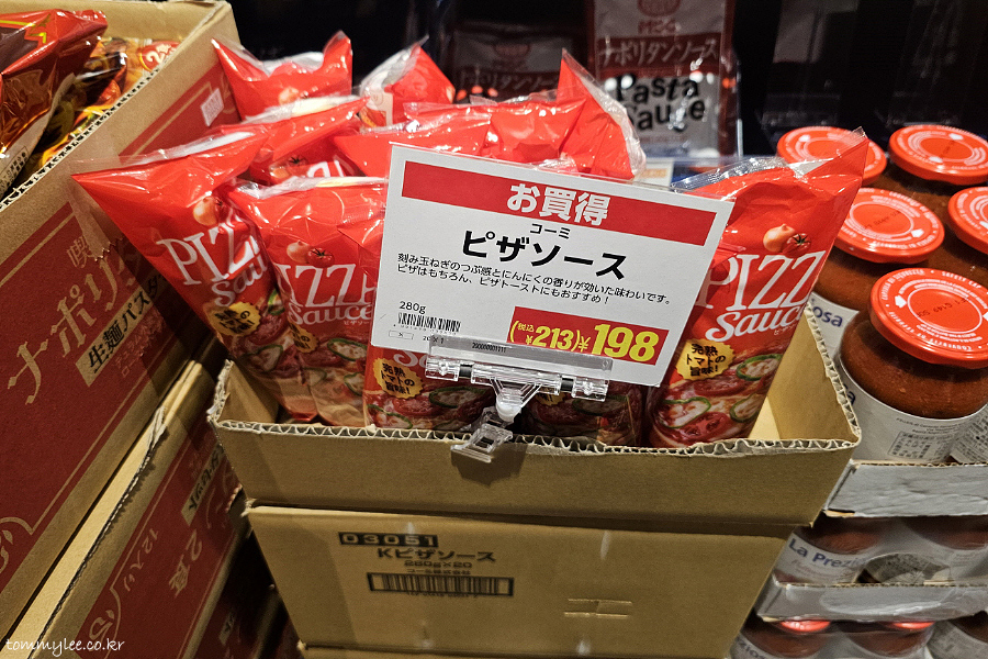 오토쿠~라고 쓰여있는 건 가성비 상품입니다.. 가격표도 빨간색으로 나와 있죠.. 코미.. 피자소스.. 213엔(2,002원)..