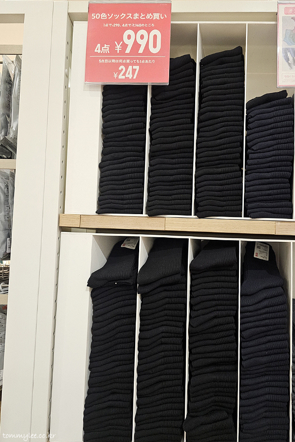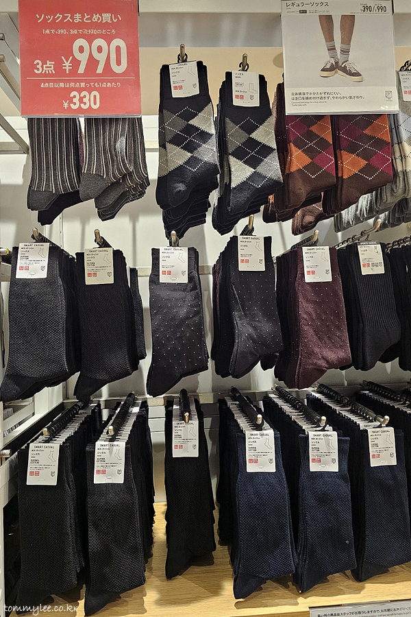 양말 가격은 옛날 그대로네요.. 4점 990엔.. 항상 이 가격이었음.. 디자인 예쁜 거나 쿠션이 붙고 길이가 짧은 건 3개 990엔으로 더 비싸고요..