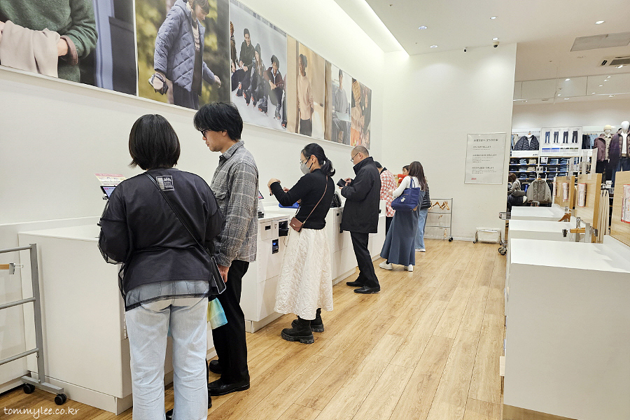 마지막으로 계산의 시간.. 유니클로 계산대의 모습인데요.. 요즘은 다 이렇게 셀프 계산이 기본입니다.. 근데 면세는 당연하게도 셀프 캐셔 이용이 안됩니다.. 직원이 있는 포스쪽으로 가셔야 하는데 안내해 주시는 분께 멘제이(免税) 또는 택스프리라고 말씀하시면 유인 계산대로 안내해 주신답니다..