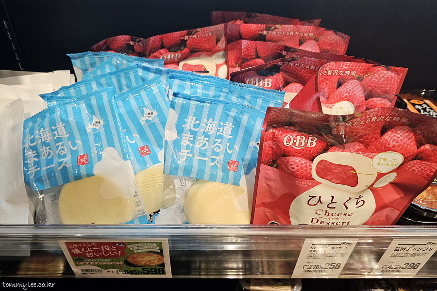 모헤지.. 홋카이도 마아루이 치즈.. 645엔(6,063원).. QBB.. 히토쿠치 치즈디저트 아마오우 딸기맛.. 278엔(2,613원)..
