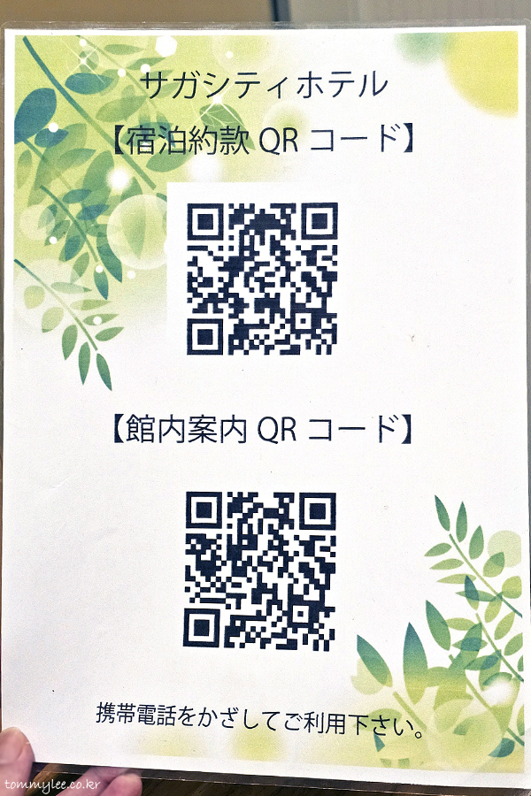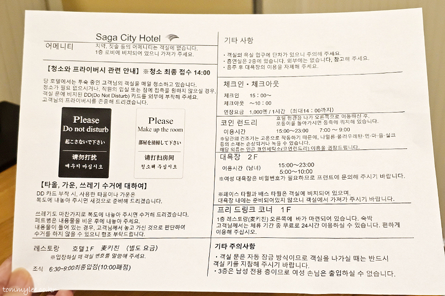 사가시티호텔 한국어 안내문.. 중요한 체크인 체크아웃 시간과 대욕장 이용시간, 호텔 편의 시설에 대한 안내가 한글로 친절하게 적혀 있습니다.. 대욕장 이용시간이 23시까지로 다른 호텔보다 일찍 마감하니 주의를..