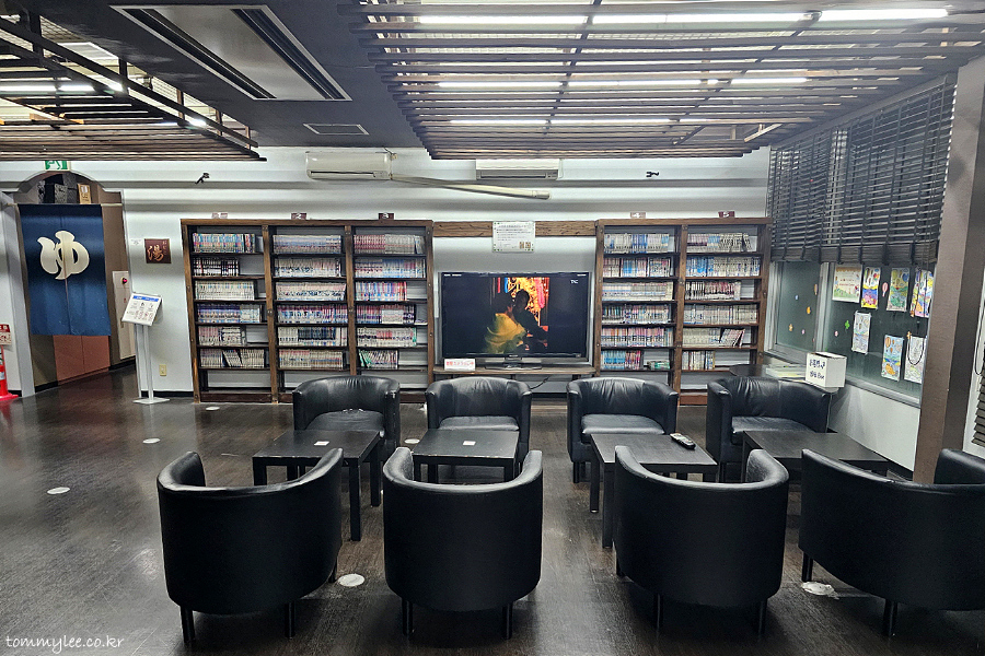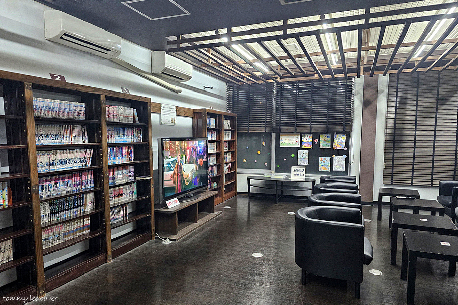 1층에는 쉴 수 있는 공간 자체가 없는데요.. 2층에 이렇게 편안하게 만화책 보면서 뒹구르르 할 수 있는 릴렉싱 스페이스가 있을 줄은 몰랐네요.. 여기가 상주하는 직원이 없어서 눈치 전혀 안보이고 자유 그 자체에요.. ㅋㅋㅋ.. 호텔 예약할 때 이런 설명이 없었는데.. ㅋㅋㅋ..