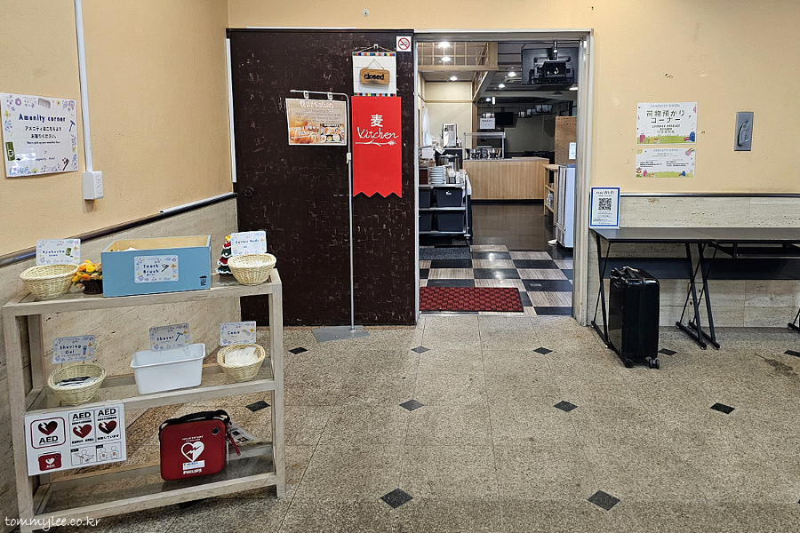 1층 로비가 좁아서 조금 불만인데 어메니티랑 드링크바 이용은 좋았네요.. 어메니티로는 녹차인 로쿠차, 치약칫솔, 면봉, 쉐이빙젤, 면도기, 일자형빗을 자유롭게 가져길 수 있게 되어 있었단.. 드링크바는 조식당인 무기키친 안에 있어요..