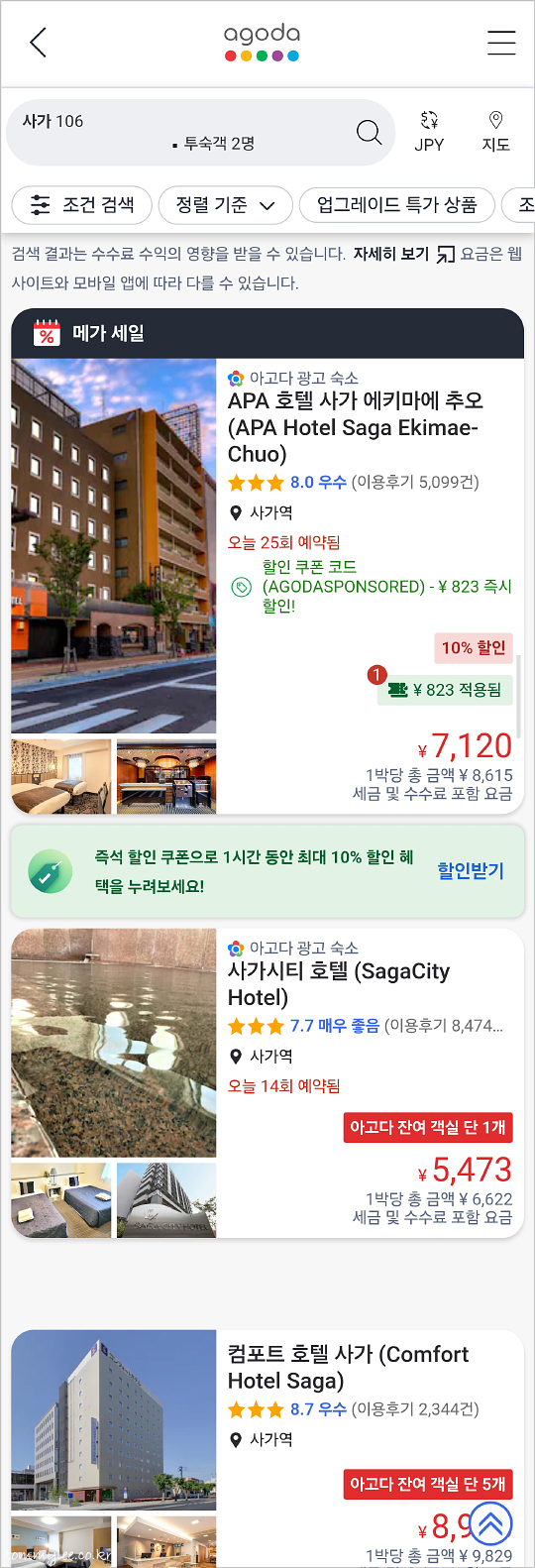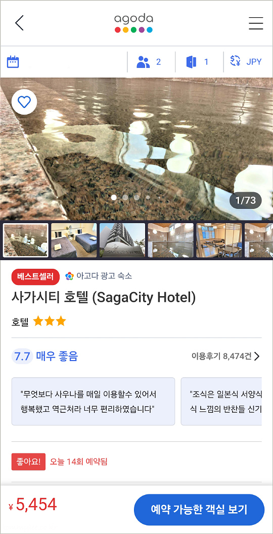 아고다에서 사가 호텔로 검색하면 2번째로 뜨는 인기 호텔이고요.. 인근 아파호텔 사가에키마에추오, 컴포트호텔 사가보다 압도적으로 저렴한 가격이긴 하더란..