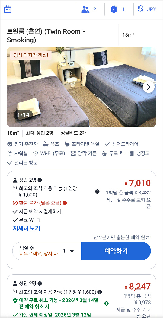 트윈 객실을 싱글 가격에 이용할 수 있는 것만으로도 저는 대만족.. 2인 1박 7천엔 진짜 맞나 싶었던..