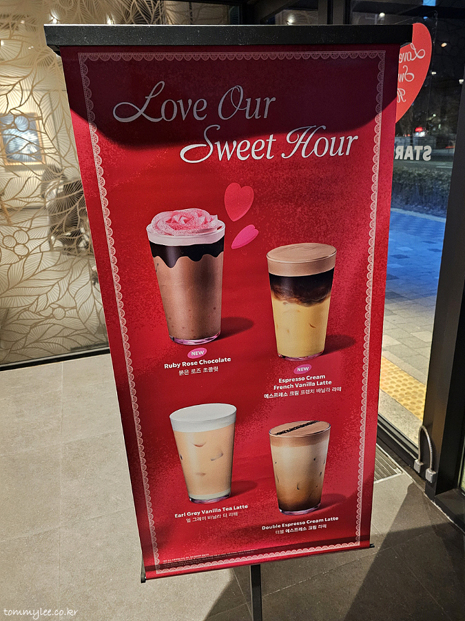 LOVE OUR SWEET HOUR.. 스타벅스 2026 발렌타인.. 러브 아워 스윗 아워.. 붉은 로즈 초콜릿, 에스프레소 크림 프렌치 바닐라 라떼, 얼그레이 바닐라 티 라떼, 더블 에스프레소 크림 라떼 프로모션 중..