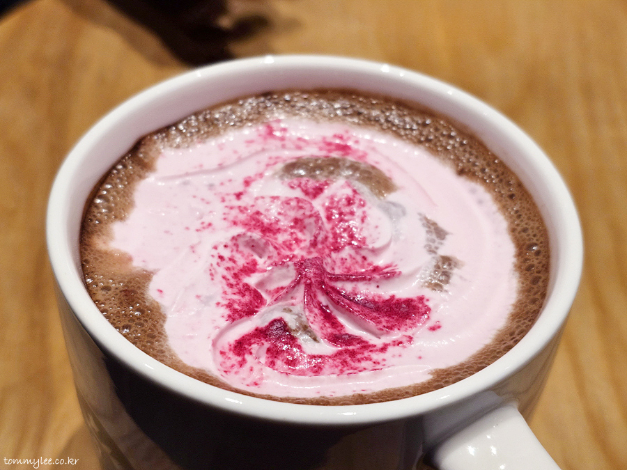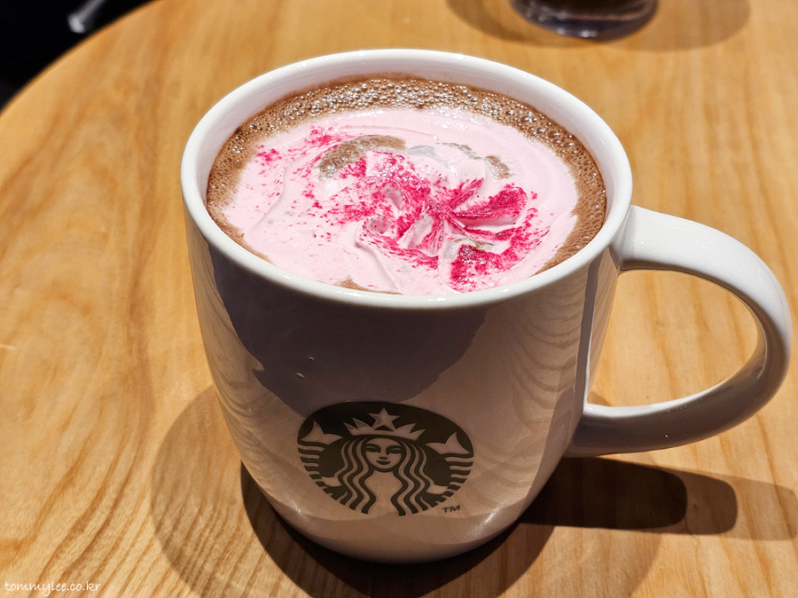 스타벅스 시그니처 초콜릿과 우유, 헤이즐넛 시럽, 초콜릿 드리즐이 들어가고.. 로즈 휘핑크림과 루비 파우더, 루비 초콜릿 토핑이 올라갑니다.. 토핑이 많긴 많네요.. 저것들이 가격 상승의 원흉이었음.. ㅡㅡㅋ..