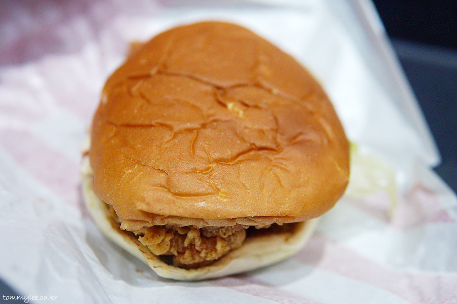 칠리 징거 통다리 버거 구성은.. 브리오슈번-마요네즈-양상추-파이어칠리소스-통닭다리살패티--오이피클-번의 순서..