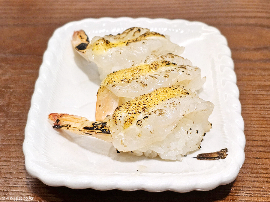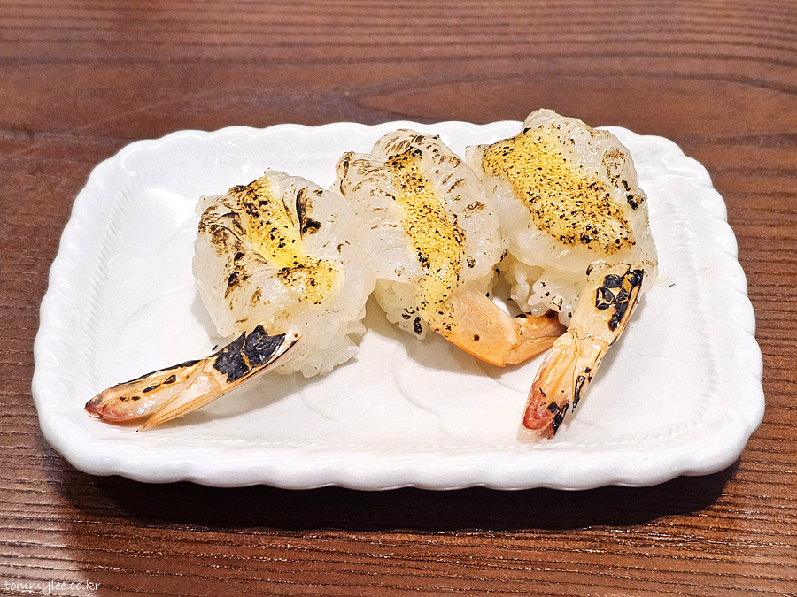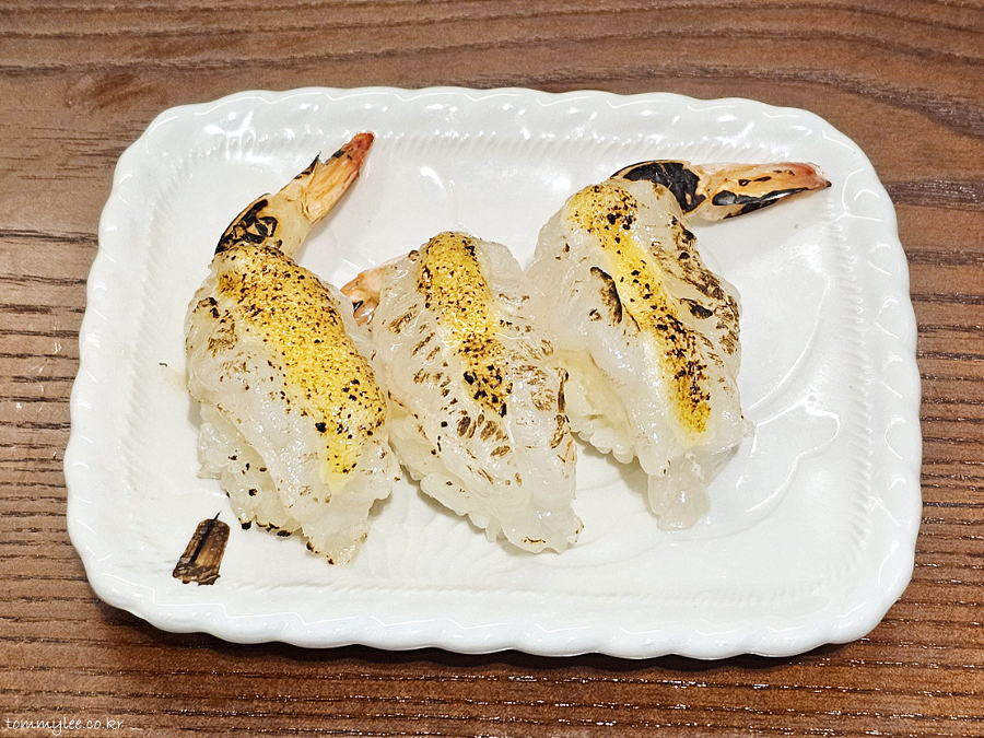 서비스 초밥으로 나온 생새우 불초밥입니다.. 거의 고정 네타인 듯.. 1인 1관이고요.. 회덮밥 먹은 저한테도 주셔서 감사..