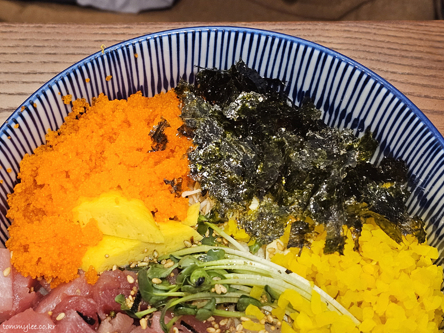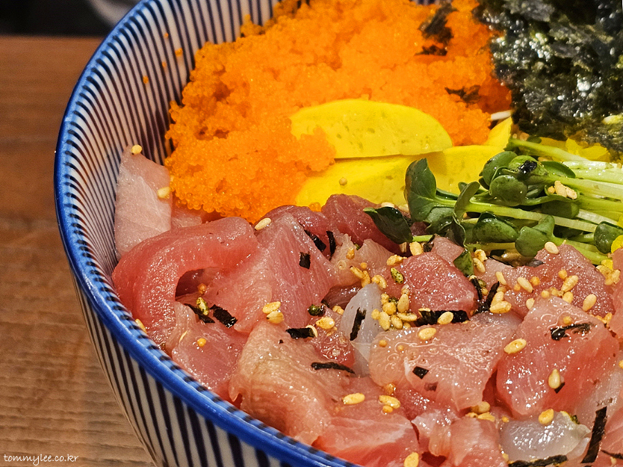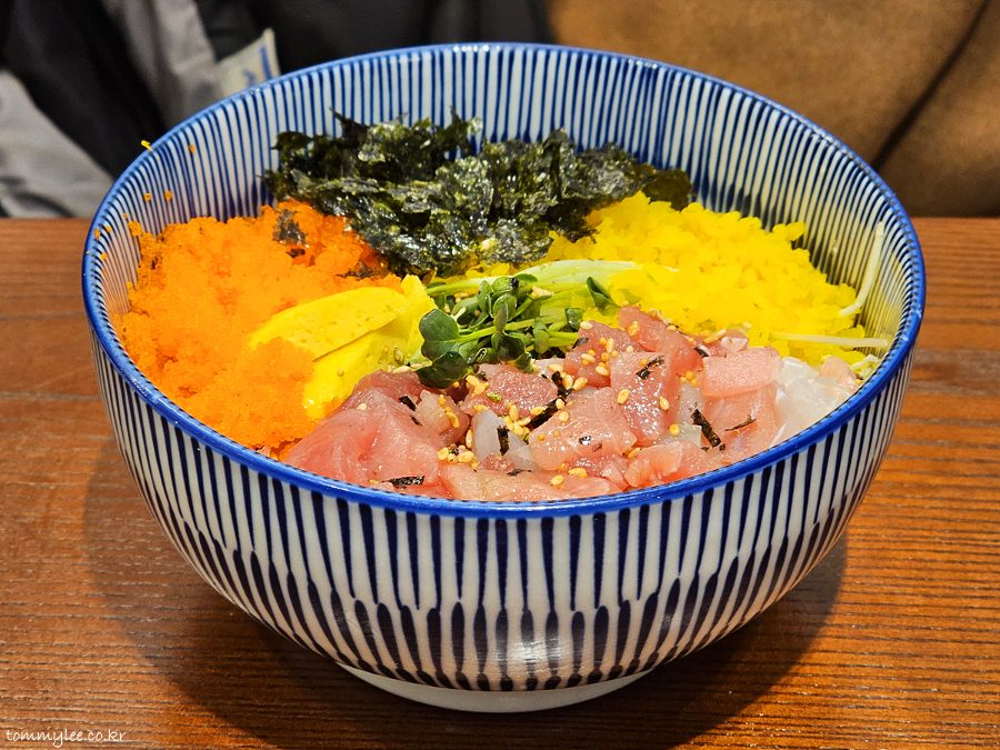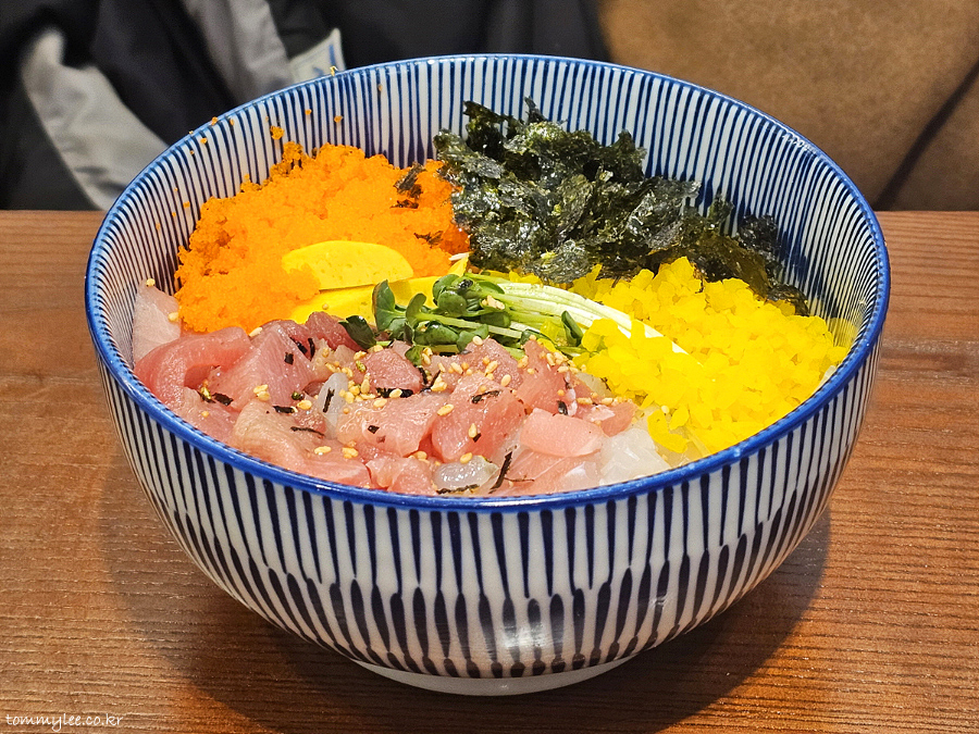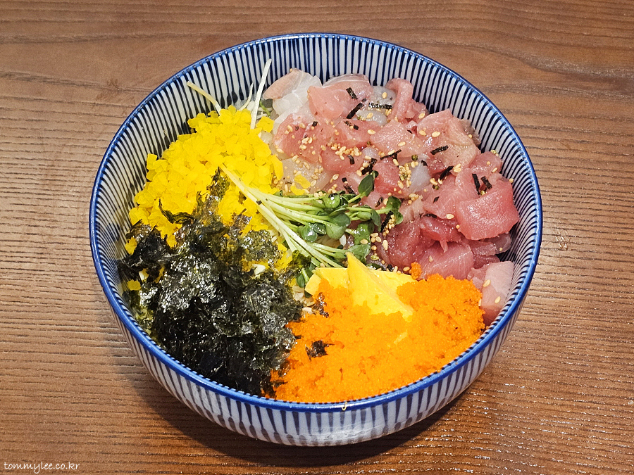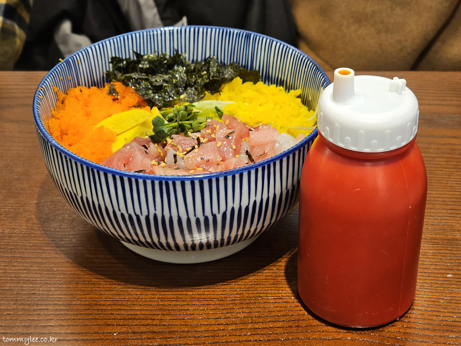 초장 소스가 함께 제공된답니다.. 간장을 곁들여 먹는 일본식 회덮밥인 카이센동과는 관계가 없는 메뉴이고, 사실 한식에 더 가까워요.. 한국에만 있는 회 비빔밥으로 보셔도 되는 메뉴..