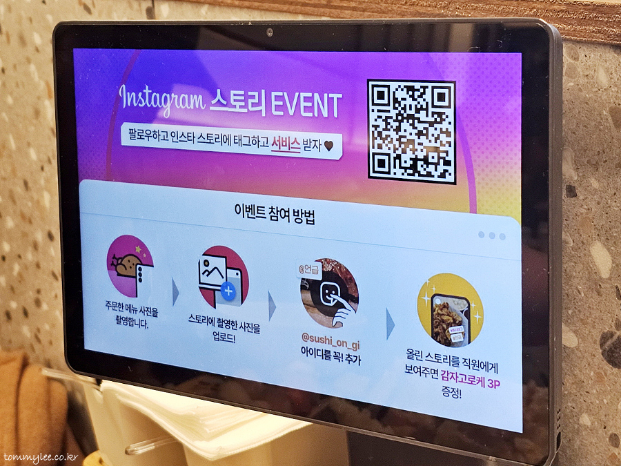 이번 방문에도 인스타그램 이벤트에 참여했답니다.. 스시온기 메뉴 사진이나 동영상을 인스타 스토리에 스시온기 계정을 언급하면서 업로드 하심 되는 이벤트.. 영수증을 미리 뽑아달라고 요청할 필요가 없기 때문에 네이버플레이스 이벤트 보다 이게 더 쉬워요..