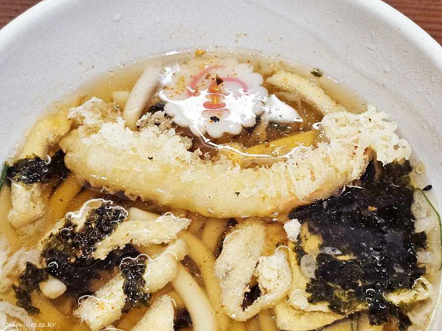 슬라이스 한 유부와 텐가스와 김가루가 우동을 뒤덮고 있는 모습이 되겠고요.. 여기에 부산어묵이 한 조각 추가됩니다..