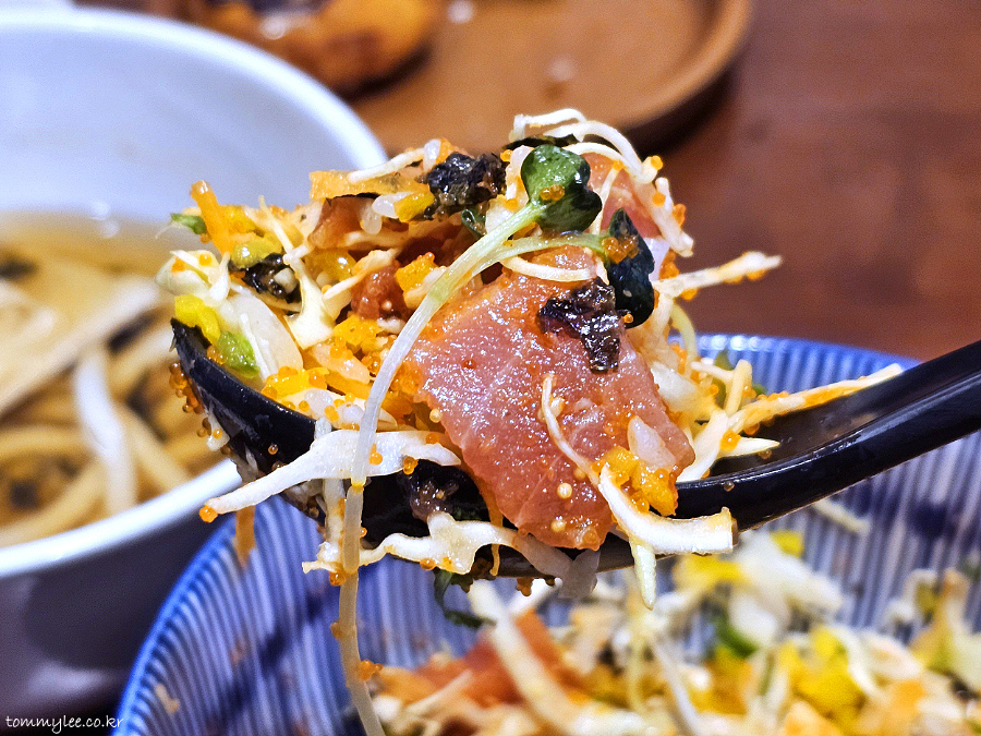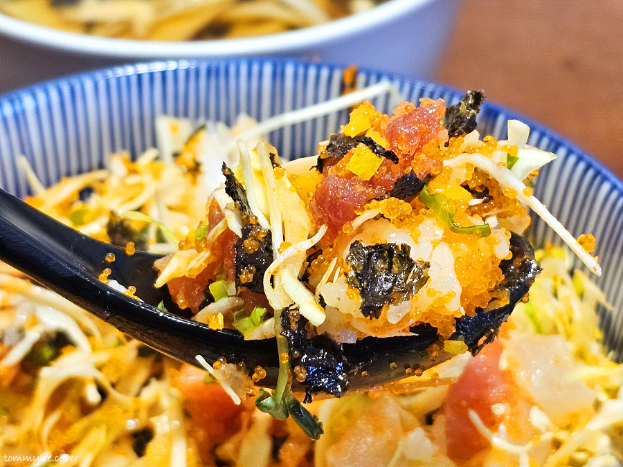 토핑과 밥 중간에 자리한 양배추 양이 엄청 많기도 해서 사각사각한 텍스처를 주는데.. 이게 샐러드 덮밥스러운 느낌도 주는지라 뭔가 건강한 느낌마저 들어요.. ㅋㅋㅋ..