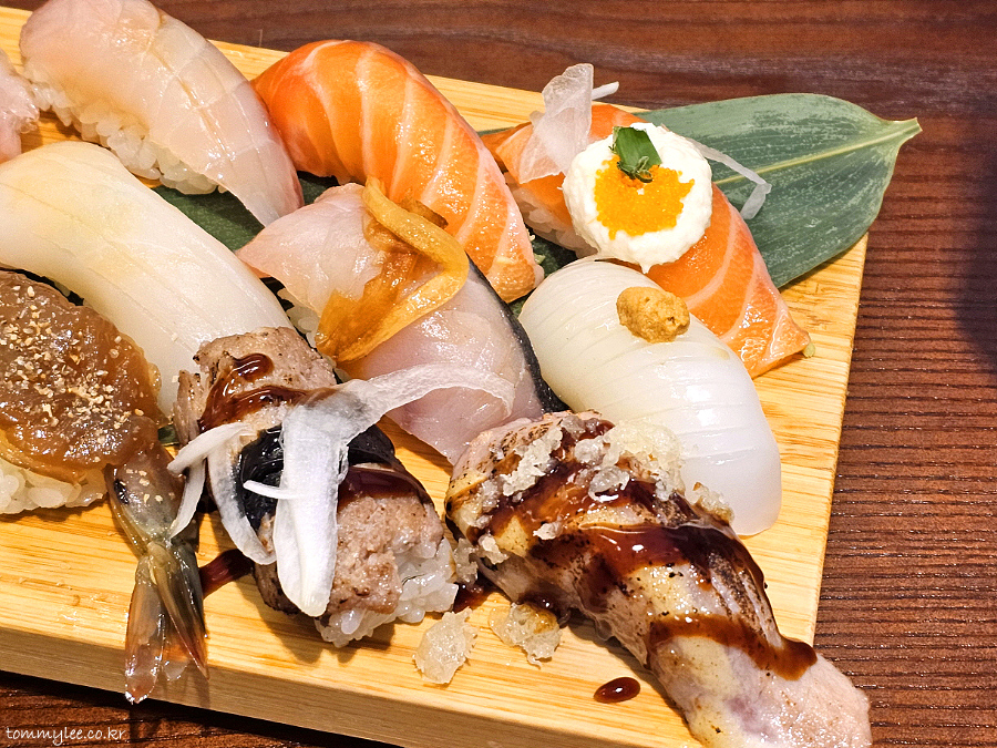 특선초밥 구성을 살펴보면.. 윗 줄부터 생선스테이크, 와규스테이크, 간장새우, 생새우 / 갑오징어, 전갱이, 황새치, 참치 / 양파연어, 연어, 도미, 광어의 순서입니다.. 구성은 이전 방문 때와 동일하네요..