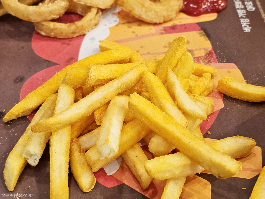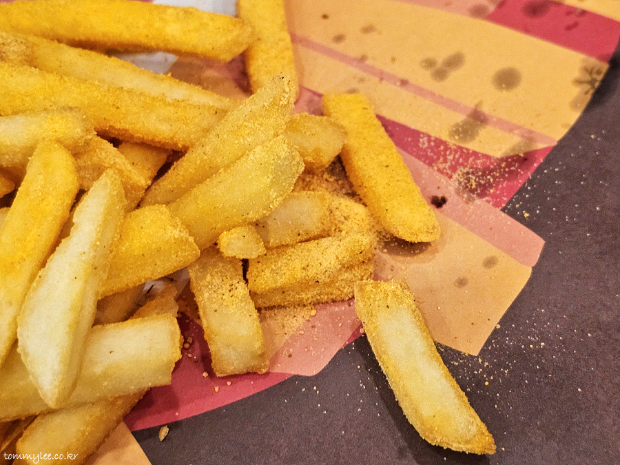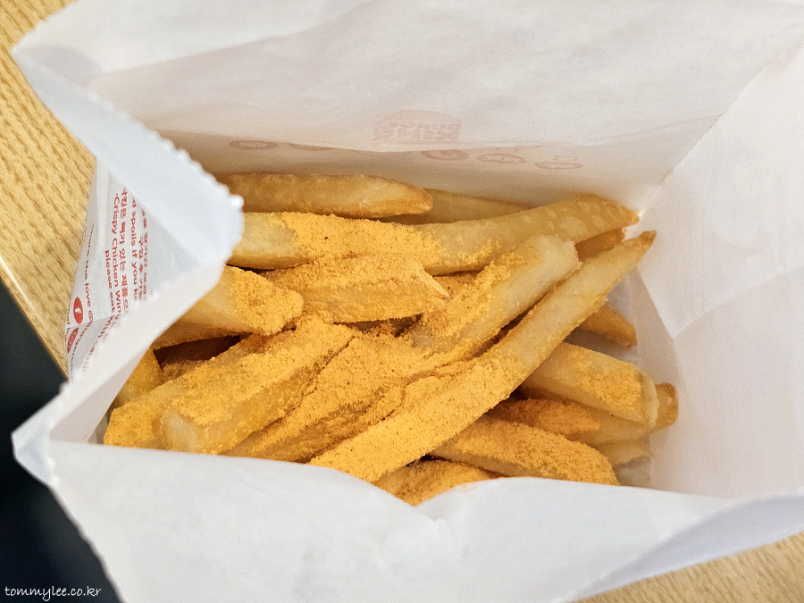 버거킹에선 프렌치 프라이 별로라고 해서 쉐이킹 프라이를 오랜만에 주문해봤습니다.. 시즈닝은 구운갈릭, 매콤치즈, 스윗어니언 3종이 있는데.. 칠리+치즈인 듯한 매콤치즈로 선택해봤습니다..