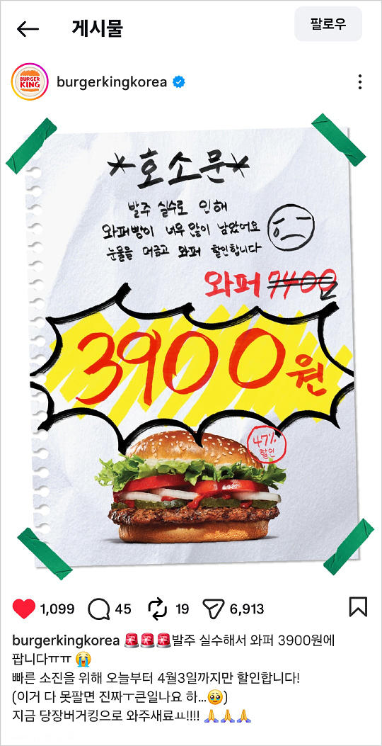 버거킹 인스타그램에 올라온 와퍼빵 발주 실수 호소문.. ㅋㅋㅋ.. 와퍼빵을 실수로 너무 많이 발주한 관계로 와퍼를 4월1일~3일 3일 간 3,900원에 판매한다는 훈훈한 내용입니다..