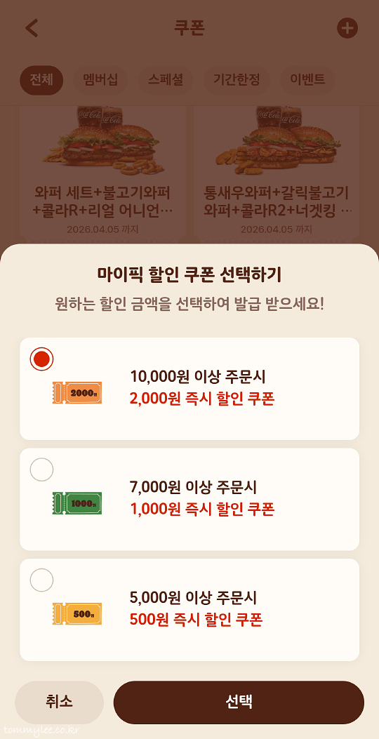버거킹 방문 전 4월 버거킹 할인 쿠폰도 점검해봤습니다.. 치즈와퍼세트+너겟킹8조각 11,100원, 불고기와퍼세트+21치즈스틱 8,700원, 치즈와퍼주니어세트 6,400원, 와퍼주니어세트 6,100원, 갈릭불고기맥시멈2세트 12,000원, 갈릭불고기맥시멈3세트 15,200원, 갈릭불고기맥시멈원파운더세트 18,800원, 콰트로치즈콰트로페퍼큐브스테이크세트 11,800원, 콰트로페퍼큐브스테이크세트 10,800원, 터프페퍼큐브스테이크세트 11,800원, 더크리스퍼세트 7,000원, 더크리스퍼베이컨&치즈세트 8,000원, 오리지널뉴욕스테이크세트 11,600원, 베이비버거세트 12,400원, 치킨킹세트 8,000원, 통새우슈림프버거세트 6,800원, 와퍼세트+불고기와퍼어니언링세트 15,400원, 통새우와퍼+갈릭불고기와퍼2인세트 17,600원, 먼슬리 마이픽 할인쿠폰.. 역시 쿠폰의 버거킹.. 쿠폰이 압도적으로 많긴 함.. ㅋㅋㅋ..