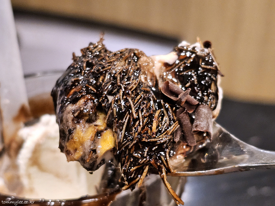 초콜릿 프라페에 콘후레이크를 쌓아 올리고 그 위에 카다이프를 잔뜩 올린 후 초콜릿 소스 투척, 컬 초콜릿을 풍성하게 올려 마무리입니다.. 만드시는 거 봤는데 초콜릿 소스가 진짜 말 그대로 투척 수준이었음.. ㅋㅋㅋ..