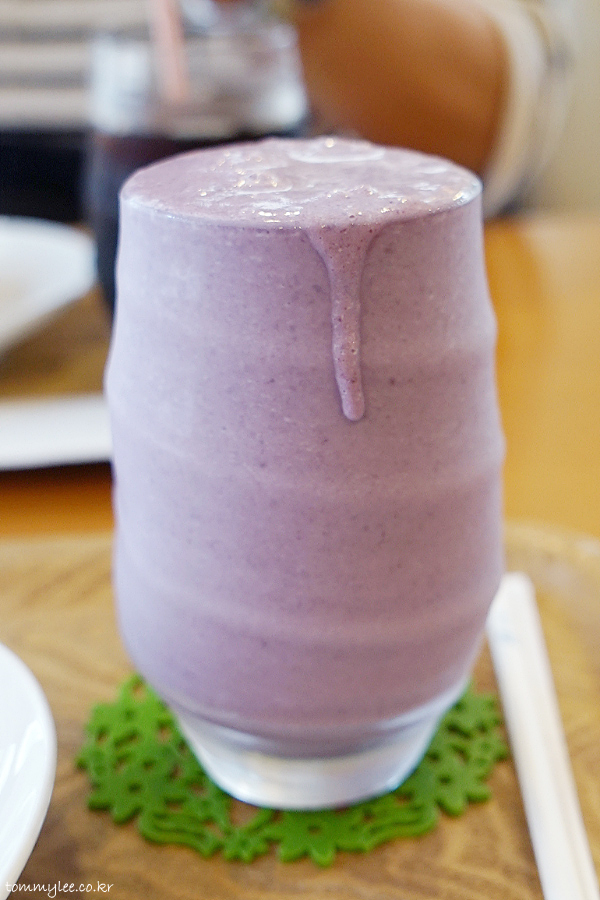 블루베리 스무디 느낌이 나는데요.. 자색 고구마를 사용해서 이 이쁘장한 색이 나오는 듯.. 이름은 군고구마 주스지만 사실상 군고구마 스무디.. 생각대로 엄청 맛있어요.. 고구마맛이 내추럴하면서 엄청 진함.. ㅋㅋㅋ..