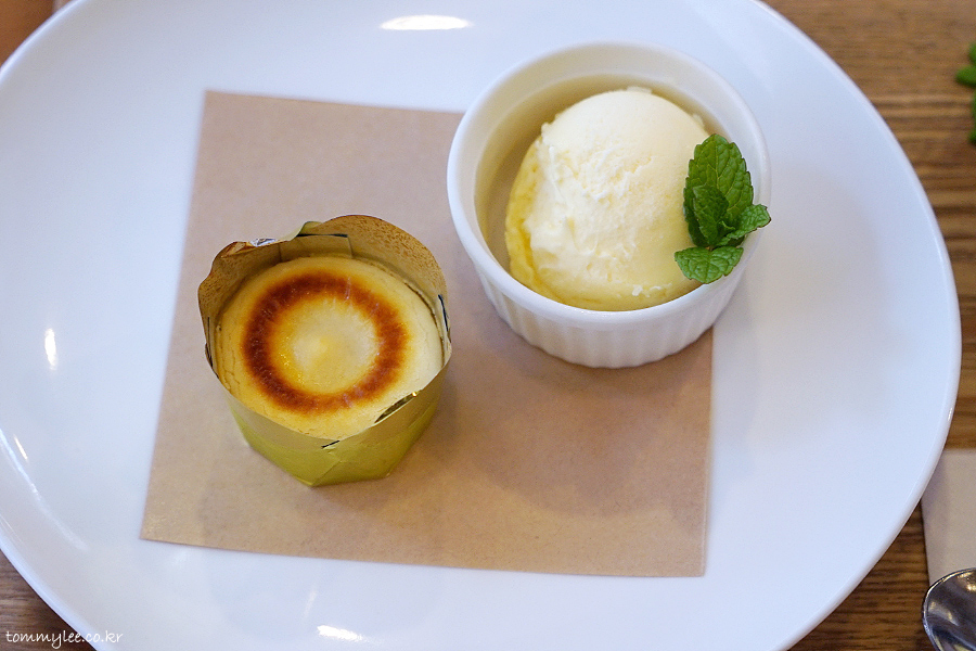 고구마 레어 치즈케이크인 러블리와 바닐라 아이스크림이 제공된 모습이 되겠고요..