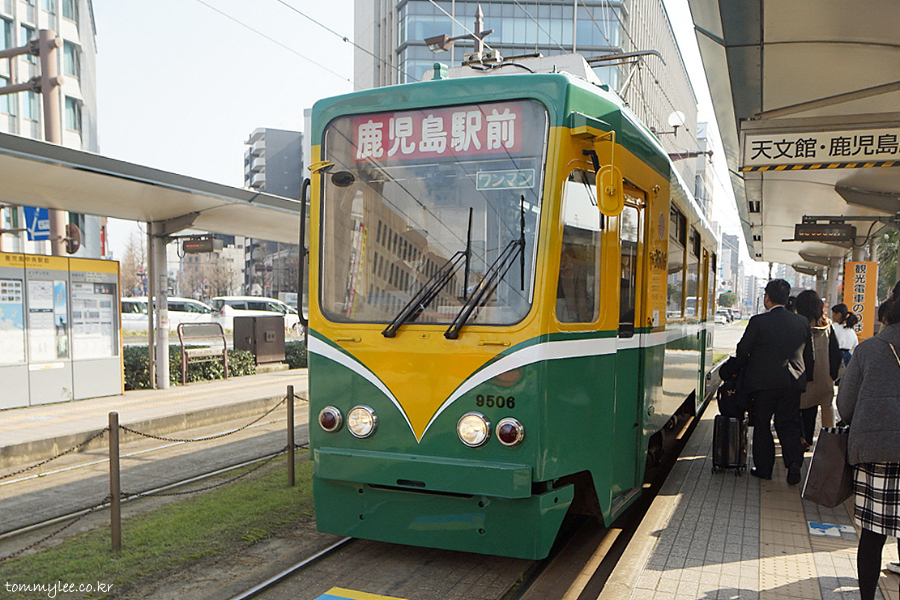 반대편에서 카고시마에키마에행 전차가 들어와서 바로 찰칵.. 이 녹색에 노란색 전차가 카고시마 시덴의 기본 디자인입니다..
