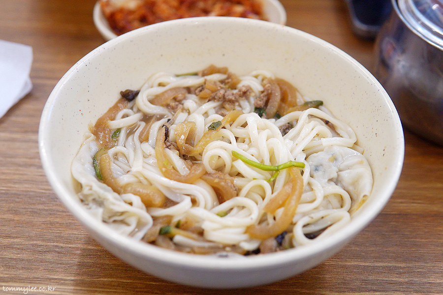 닭 육수와 고기 고명에 볶은 양파, 부추, 목이버섯, 애호박이 들어가서 달큼한 맛과 스모키한 불맛이 나는 게 명동교자 칼국수 국물의 특징..