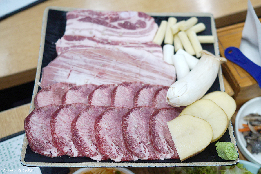 고기고 생각보다 빨리 제공되었어요.. 고기 원산지는 돼지고기 국내산, 우설은 한우라고 합니다.. 여긴 그래도 양이 넉넉한 편이네요..