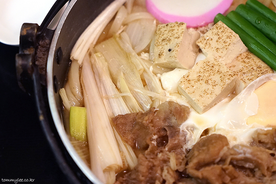 스키야키나베 우동을 위에서 바라보면 이런 느낌.. 스키야키고기랑 대파, 양파, 계란, 모멘두부, 시메지버섯에 카마보코까지 풍성풍성..