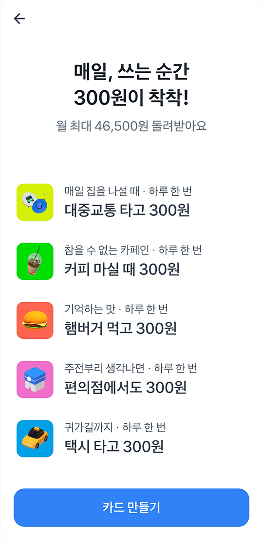 매일, 쓰는 순간 300원이 착착~.. 월 최대 46,500원을 돌려 받을 수 있다고 하네요.. 일단 자주 써라.. 소액결제의 소소한 즐거움을 주겠단 컨셉인듯..