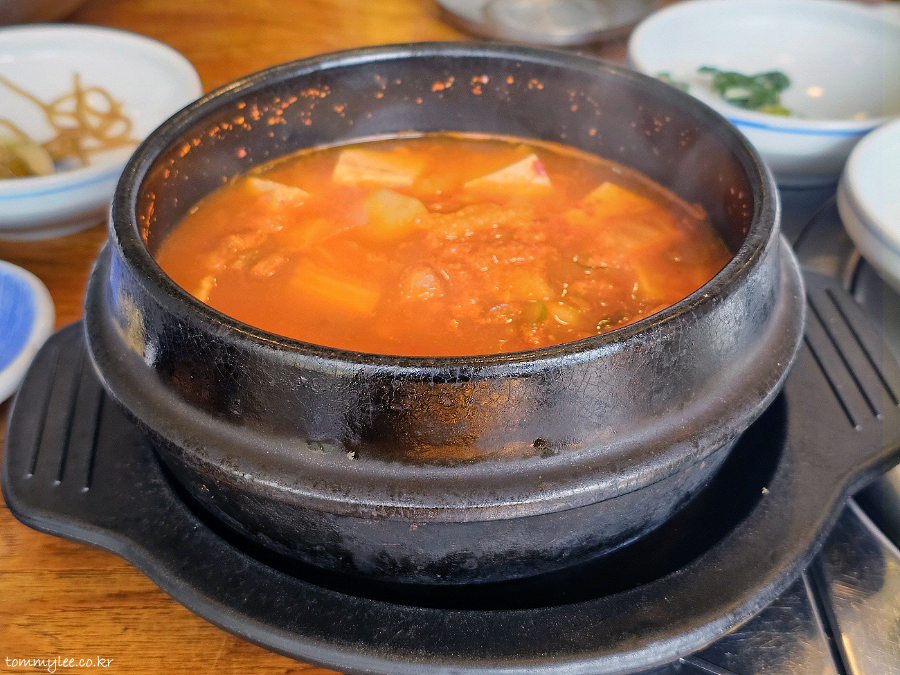 맹렬하게 연기를 뿜어내며 나온 뚝배기 김치찌개.. 국 대신에 찌개가 제공되네요.. 오호~..