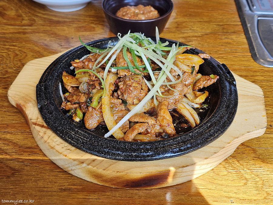뜨거운 무쇠 플레이트에 제공된 제육 불고기의 모습이 되겠습니다.. 비빔밥보다 더 빨리 나온 점을 지인분께서 높이 평가해 주셨습니다..
