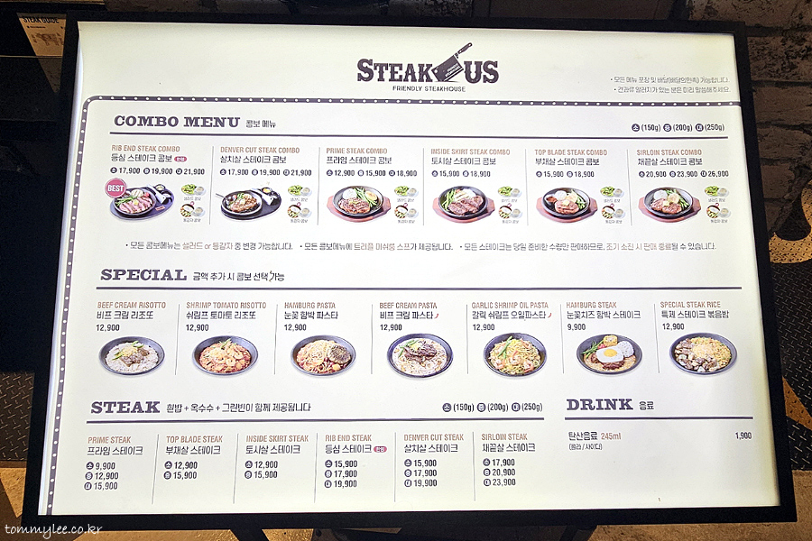 스테이크어스 메뉴 및 가격.. 프라임 스테이크 9,900원, 부채살 스테이크 12,900원, 토시살스테이크 12,900원, 등심 스테이크 15,900원, 살치살 스테이크 15,900원, 채끝살 스테이크 17,900원 / 비프크림 리조또 12,900원, 쉬림프토마토 리조또 12,900원, 눈꽃함박 파스타 12,900원, 비프크림 파스타 12,900원, 갈릭쉬림프 오일파스타 12,900원, 눈꽃치즈 함박스테이크 9,900원, 특제 스테이크볶음밥 12,900원.. 스테이크 사이즈 : 소 150g, 중 200g, 대 250g..