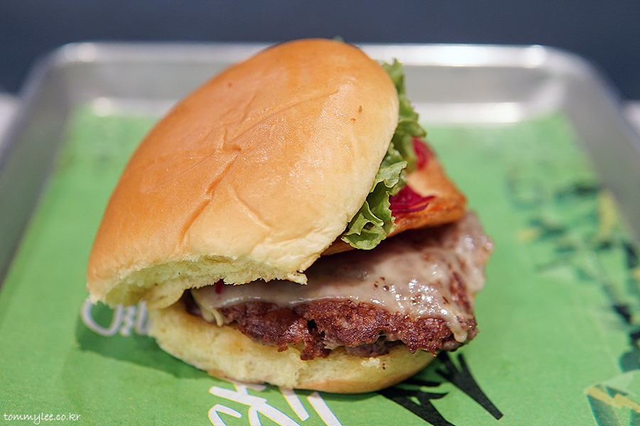 옆에서 바라보면 요런 느낌입니다.. 패티에 치즈가 완벽하게 녹아내린 모습 확인할 수 있었네요.. 쉑쉑은 치즈와 패티가 따로 놀지 않는다는 거.. 이런 게 퀄리티의 차이..