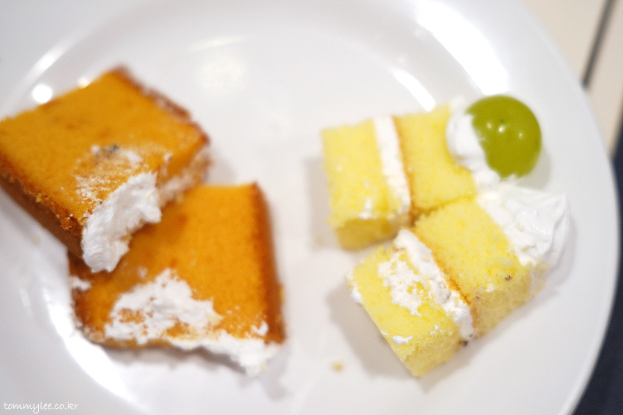 캐러멜 월넛 카스텔라와 샤인 생크림 케이크.. 샤인머스캣 축제였지만 정작 샤인머스캣을 먹은 건 케이크 위에 저 한 알이 전부.. 샤인머스캣과 디저트에는 전혀 관심 없으셨던 지인분들.. 샤인머스캣보다 망고가 더 맛있다고.. ㅋㅋㅋ..