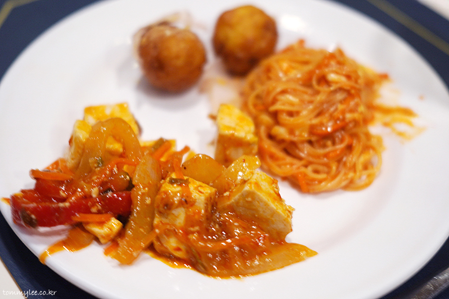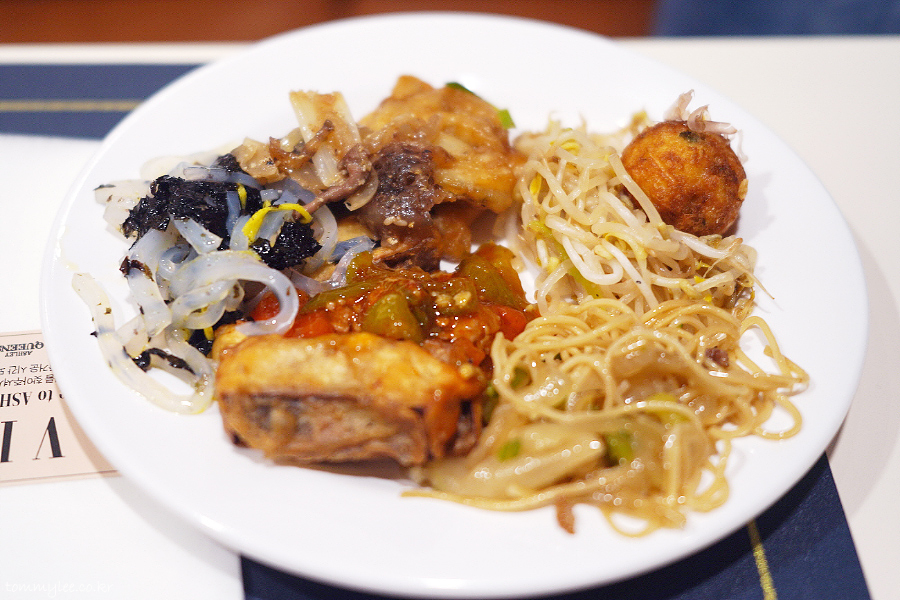 지인분의 첫 접시.. 뭔가 많이 정신없이 담아 오긴 하셨네요.. 사진 찍을 줄 모르셨다고 합니다.. 청포묵무침, 숙주볶음과 타코야키, 차오멘의 이상한 조합..