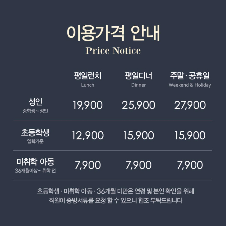 애슐리퀸즈 이용가격 안내.. 성인 : 평일런치 19,900원, 평일디너, 25,900원, 주말공휴일 27,900원 / 초등학생 : 런치 12,900원, 디너 15,900원 / 미취학아동 7,900원..