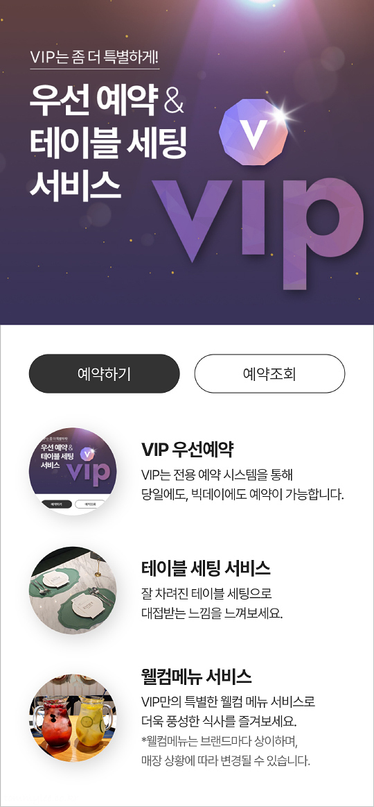 최근 VIP예약 서비스로 장난치는 분들이 있는지.. 예약가능 기간이 2주 이내로 변경되었고, 1회 예약 가능 횟수 또한 브랜드 별 1회로 제한된다는 공지가 있습니다.. 노쇼 페널티가 없어서인 듯.. 노쇼는 범죄입니다..